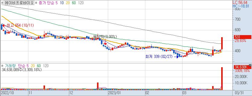 4. 에이비프로바이오 ( 195990 / 코스닥 ) - 현재가 531원