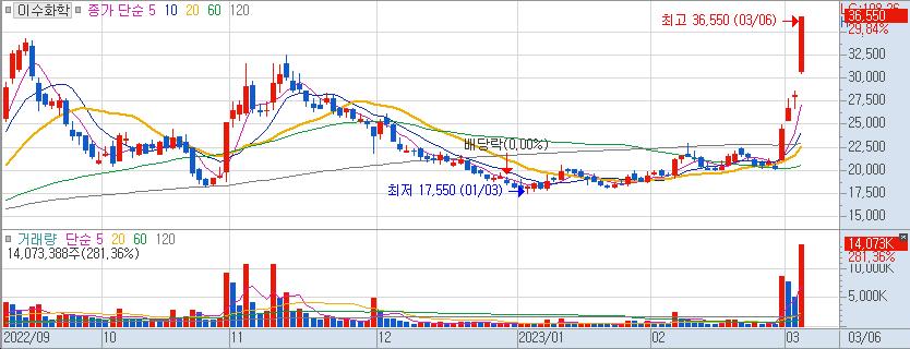 1. 이수화학 ( 005950 / 코스피 ) - 현재가 36,550원