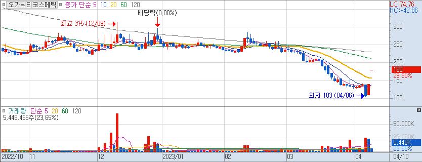 8. 오가닉티코스메틱 ( 900300 / 코스닥 ) - 현재가 180원